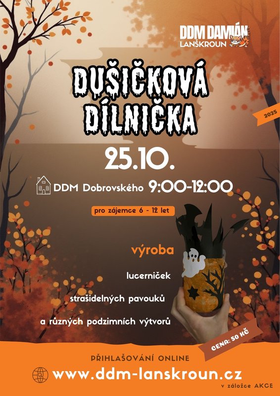Zveme všechny šikovné děti od 6 do 12 let na Dušičkovou dílničku, která se uskuteční v sobotu 25. října od 9:00 do 12:00 hod. v budově DDM Damián na ulici Dobrovského 630, Lanškroun