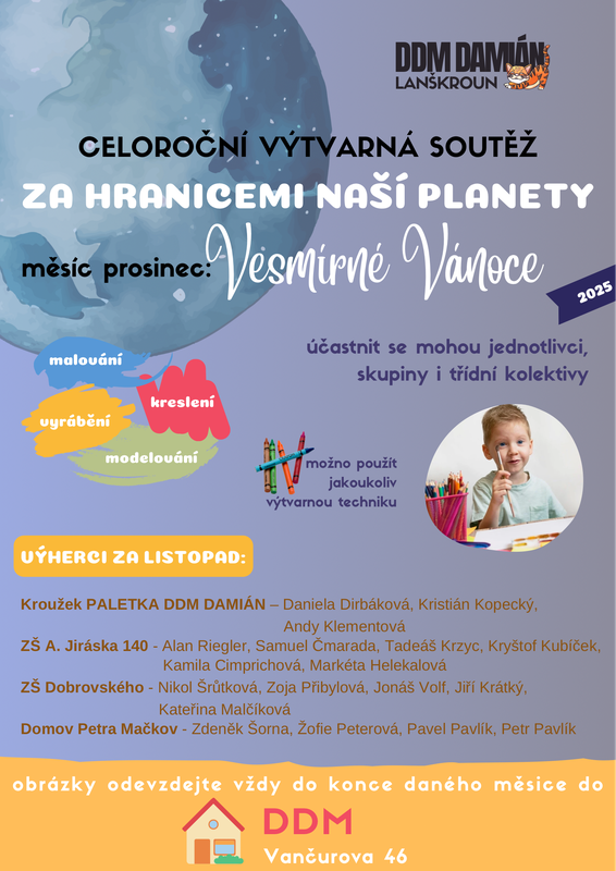 Celoroční výtvarná soutěž Za hranicemi naší planety pokračuje prosincovým tématem Vesmírné Vánoce. Využít lze libovolnou výtvarnou techniku: malování, kreslení, vyrábění, modelování…