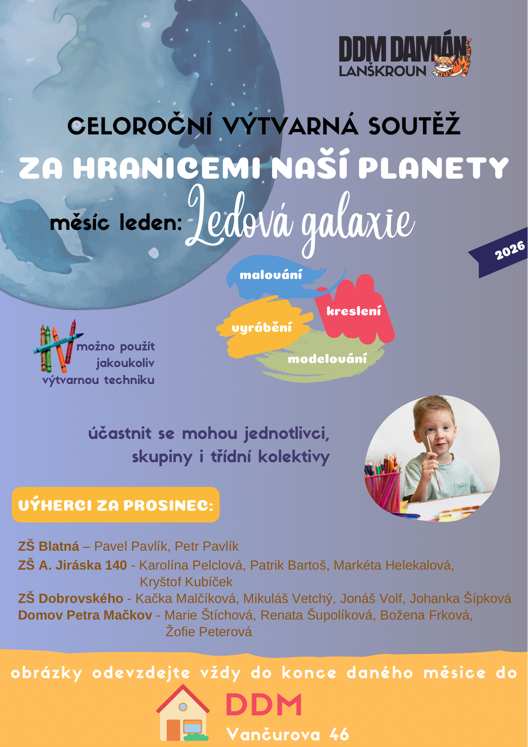 Celoroční výtvarná soutěž Za hranicemi naší planety pokračuje lednovým tématem Ledová galaxie. Využít lze libovolnou výtvarnou techniku: malování, kreslení, vyrábění, modelování…Své vesmírné obrázky odevzdejte do konce měsíce na adresu DDM Damián, Vančurova 46.Gratulujeme prosincovým vítězům.