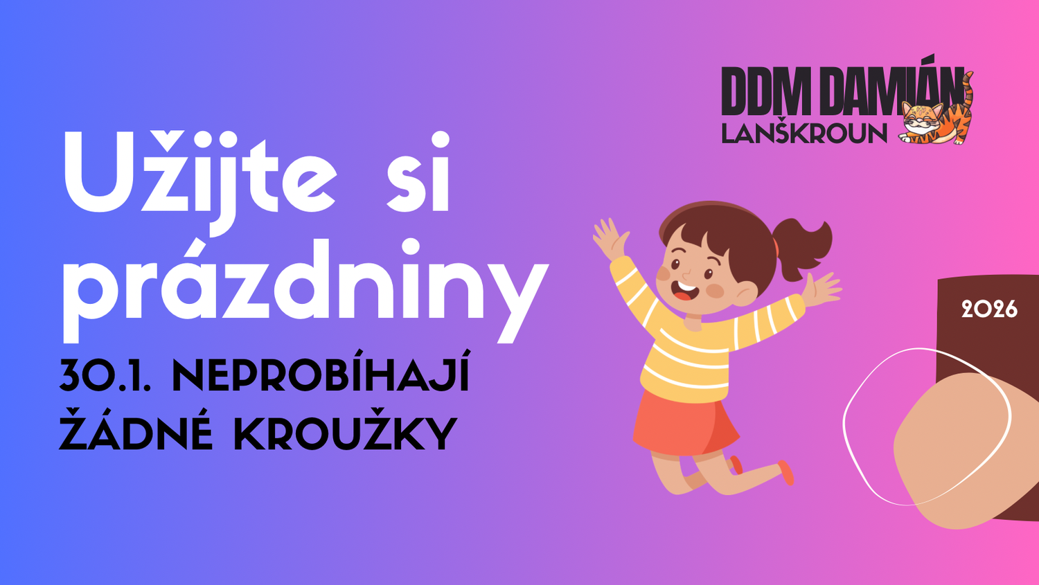 V pátek dne 31. 1. 2026 jsou pololetní prázdniny, a proto u nás kroužky neprobíhají. Užijte si volno!