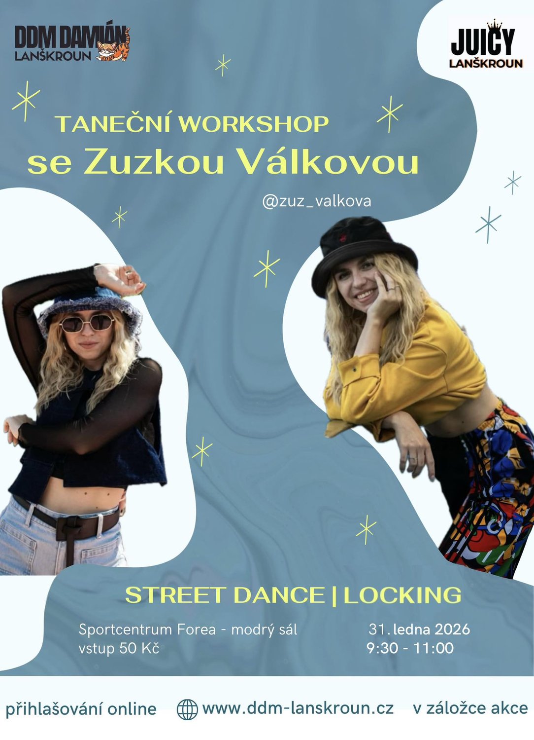 Zuzka Válková se vrací do Lanškrouna s dalším tanečním workshopem, který proběhne ve spolupráci DDM DAMIÁN a JUICY Lanškroun. Tentokrát se zaměříme na street dance a locking – energické styly plné rytmu, výrazu a radosti z pohybu.