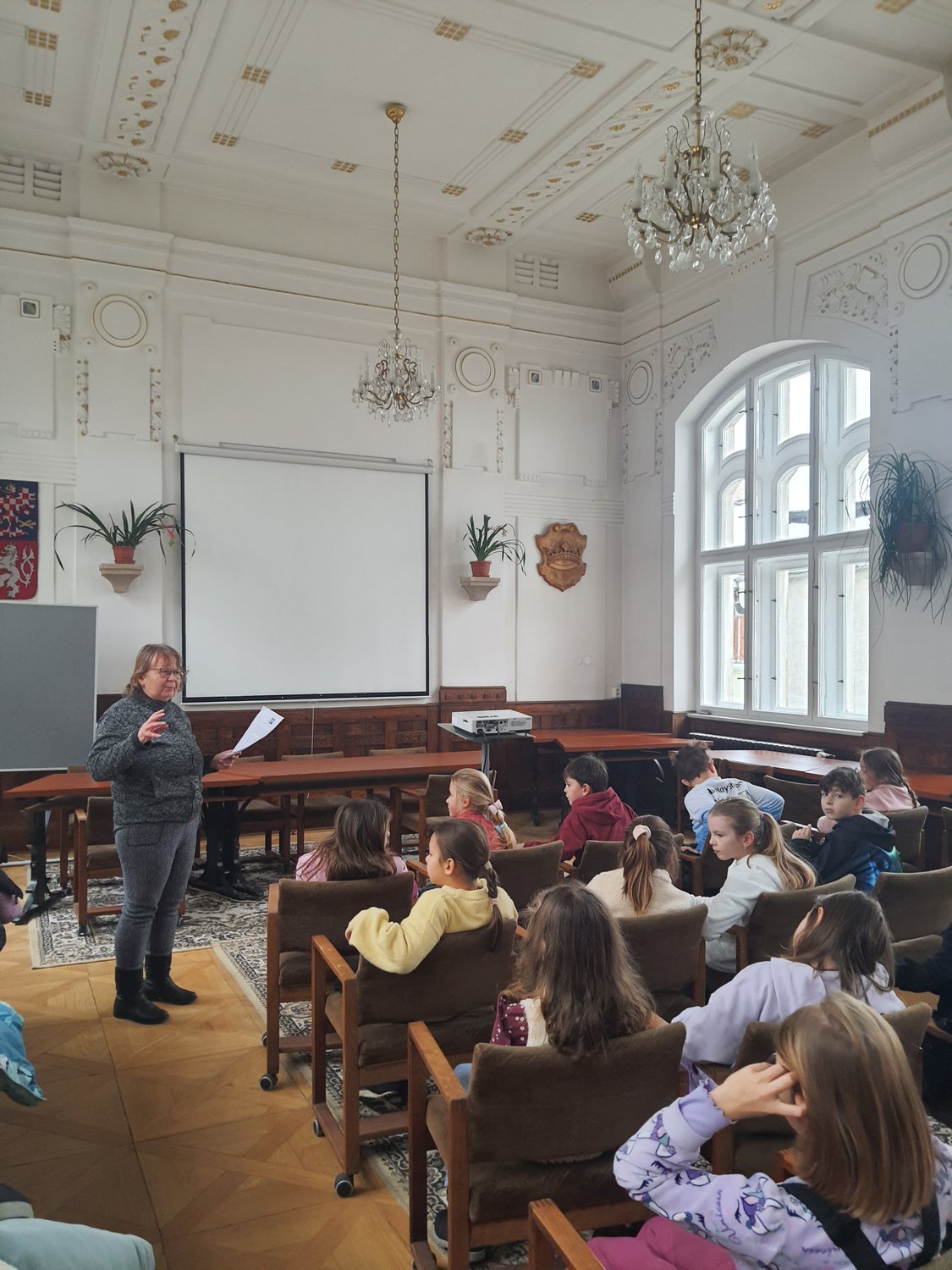 První lednové páteční dopoledne na náměstí J. M. Marků v Lanškrouně patřilo radosti, objevování a krásnému mezigeneračnímu setkání. Třeťáci ze ZŠ A. Jiráska se vydali na výukový program, NAJDI DŮM, který pro ně připravila paní ředitelka DDM DAMIÁN společně se seniorkami z Akademie třetího věku – paní Lechnýřovou, Ulmanovou a Sitovou. Tyto dámy navštěvují kurz Damián průvodcem, kde se učí historii města i práci s dětmi. Právě tento program je inspirován britskou tradicí Red Coat Guided Tours v Exeteru. Když se seniorky poprvé vydaly do ulic jako průvodkyně, připnuly si s hrdostí oranžovou průvodcovskou placku – a s obrovským nadšením se pustily do dobrovolnické role, která propojuje generace a oživuje příběhy našeho města. Děti se rozdělily do týmů a každá skupinka vyrazila se svou průvodkyní hledat jeden z domů na náměstí. Obrázky byly schválně lehce pozměněné, aby se z úkolu stalo malé dobrodružství. Pátraly po budově gymnázia, domě s domovním znamením, radnici nebo domě s korouhvičkami. Když týmy našly svůj dům, vyslechly si poutavé vyprávění o jeho historii a vyplnily kartičku s otázkami. Nakonec jsme se všichni sešli u domu s arkýřem, kde děti v zasedací místnosti městského úřadu představily, co zjistily, a nahlédly i do kanceláře městského úřadu, která se nachází přímo u arkýře.