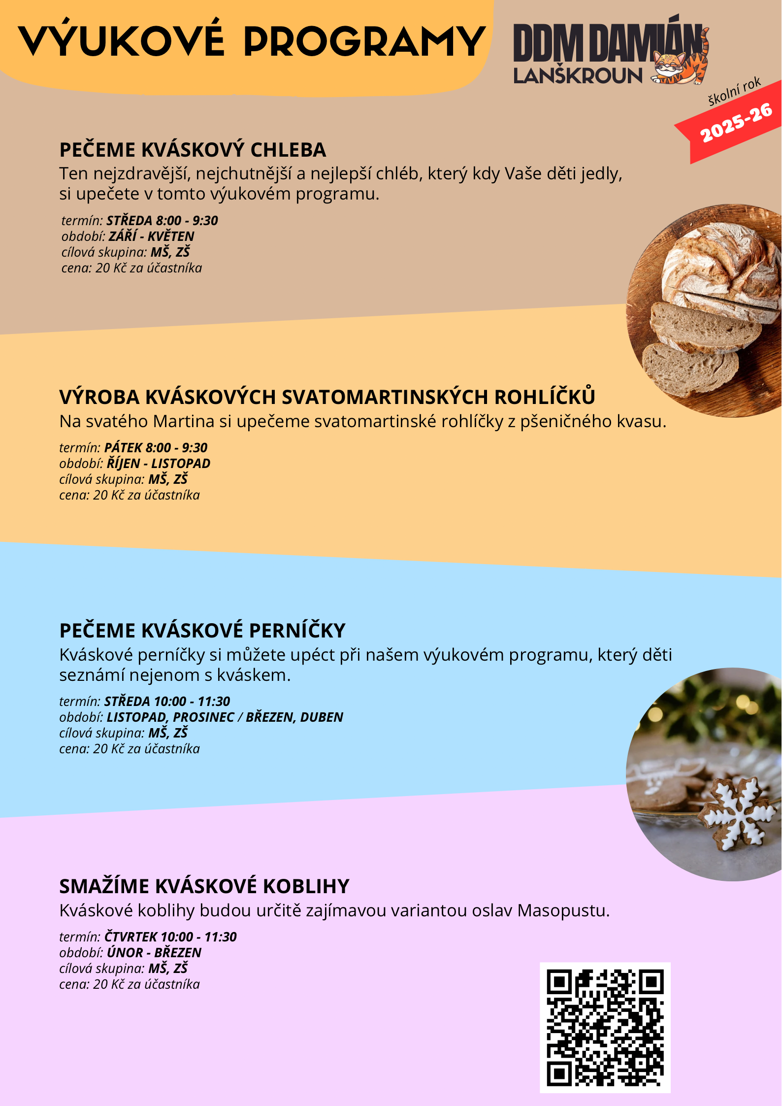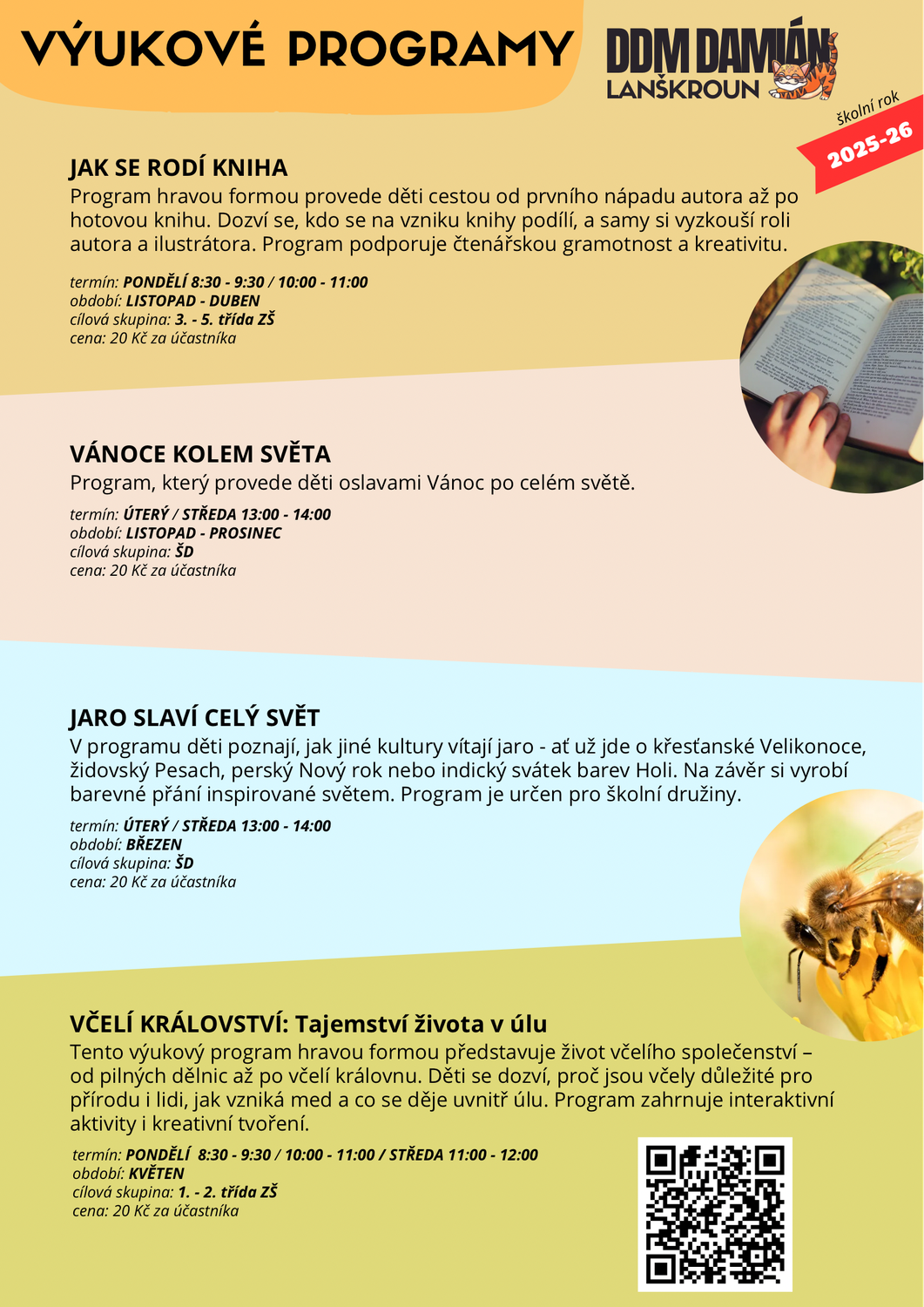 DDM DAMIÁN Lanškroun každoročně realizuje pro školy a školní družiny nabídku výukových programů na školní rok 2025/2026. Programy probíhají od září do května (u některých tematických aktivit v užším období) a jsou určeny pro děti od mateřských škol až po 6. třídu základní školy. Některé termíny jsou stále volné a školy se mohou hlásit.