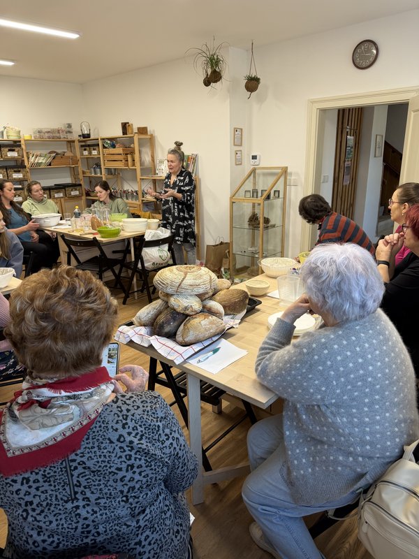 Další část kurzu pečení chleba vedla ředitelka DDM DAMIÁN, Lanškroun Iva Skalická. Všechny účastníky provedla celým procesem přípravy chleba – od překládání těsta přes stáčení až po ukládání do ošatky. Díky tomu získali všichni jasnou představu o tom, jak kváskový chléb vzniká od úplného začátku. Lektorka důraznila, že nejdůležitější je péče o kvásek. Ten její je pšeničný, a už 15 let se těší výborné kondici. Jméno nemá, ale zato má duši – a podle Ivy i vlastní osobnost. Na závěr kurzu věnovala svůj kvásek všem zájemcům, aby si mohli péct doma.