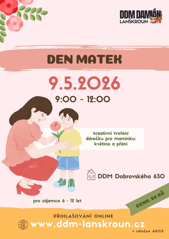 V sobotu 9. 5. 2025 od 9.00 do 12.00 hodin zveme všechny děti od 6 do 12 let na dopolední kreativní dílnu věnovanou Dni matek.