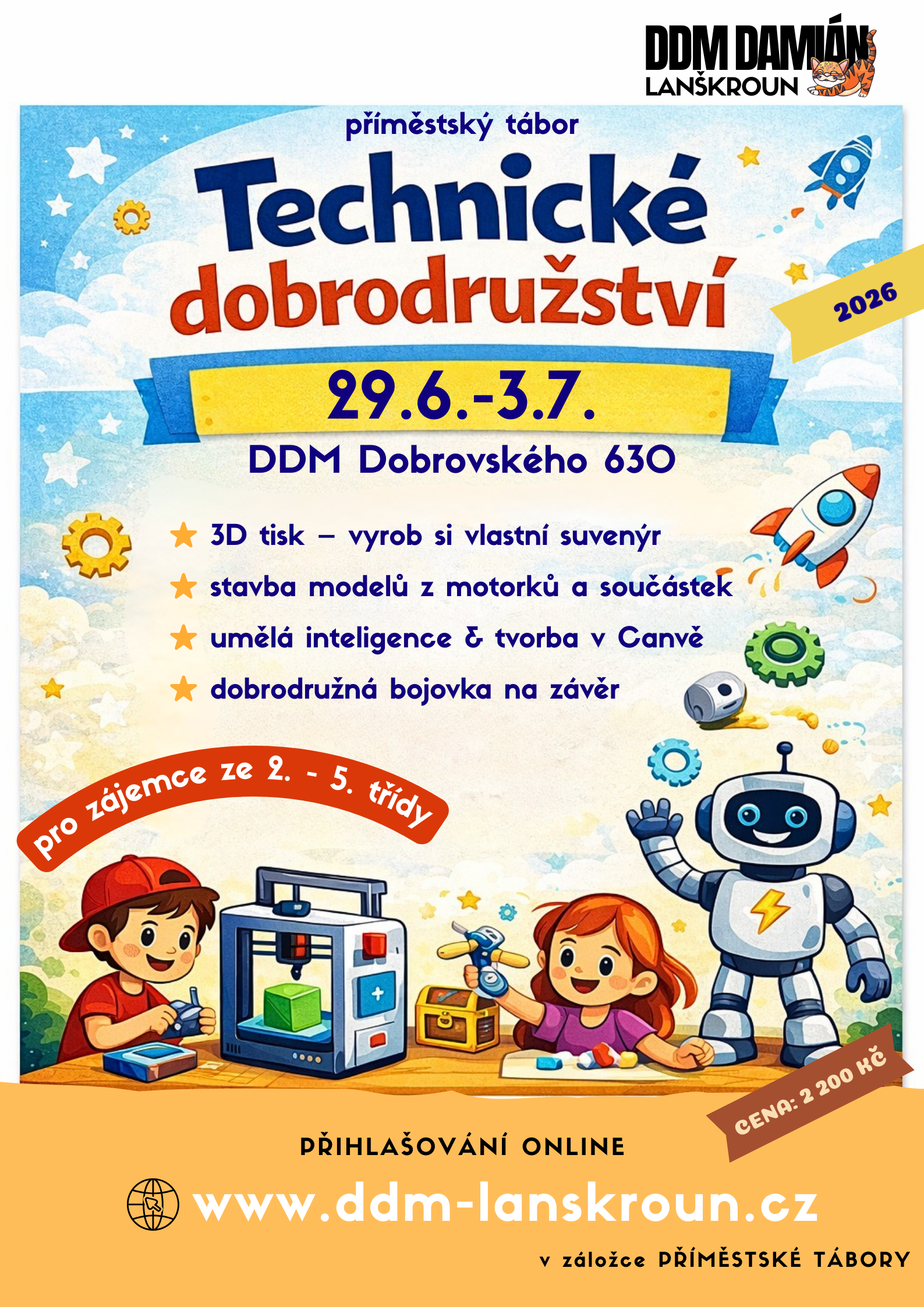 Během týdne se děti zábavnou formou seznámí se 3D tiskem – navrhnou si jednoduchý výrobek a odnesou si ho domů. Budeme tvořit také z technických součástek, jako jsou motorky, baterky a vrtulky, a z papíru si děti vyrobí vlastní pohyblivou hračku.