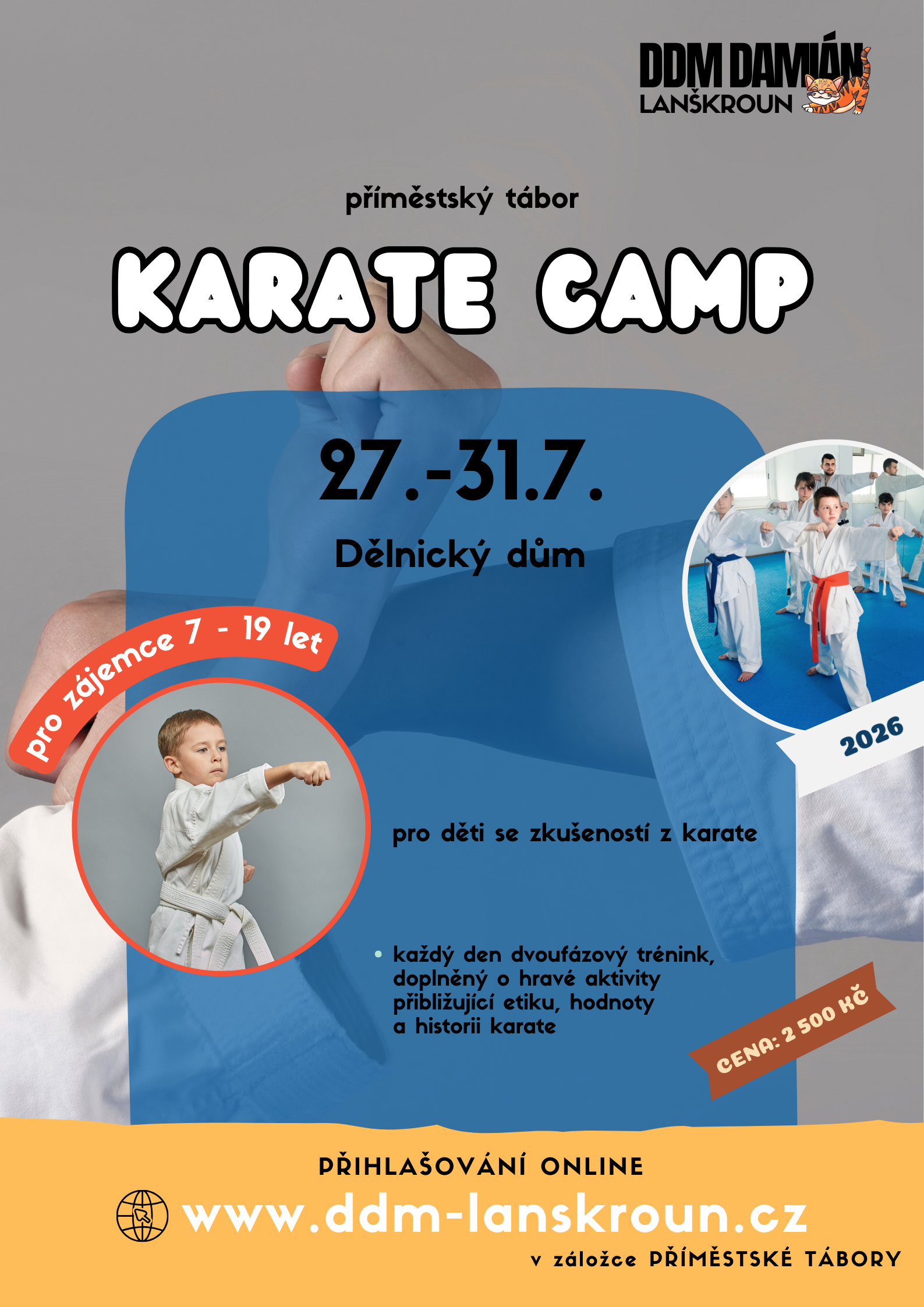 Příměstský tábor je plánován pro zájemce 7 - 19 let, kteří v uplynulých letech navštěvovali kroužek Karate.